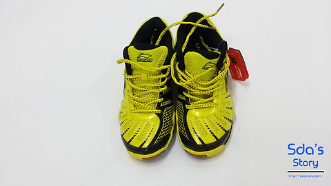 정면에서 보면 천 부분과 합성고무(레자?) 부분의 경계가 드러납니다. 그리고 앞에 리닝이라는 로고도 적혀있네요.